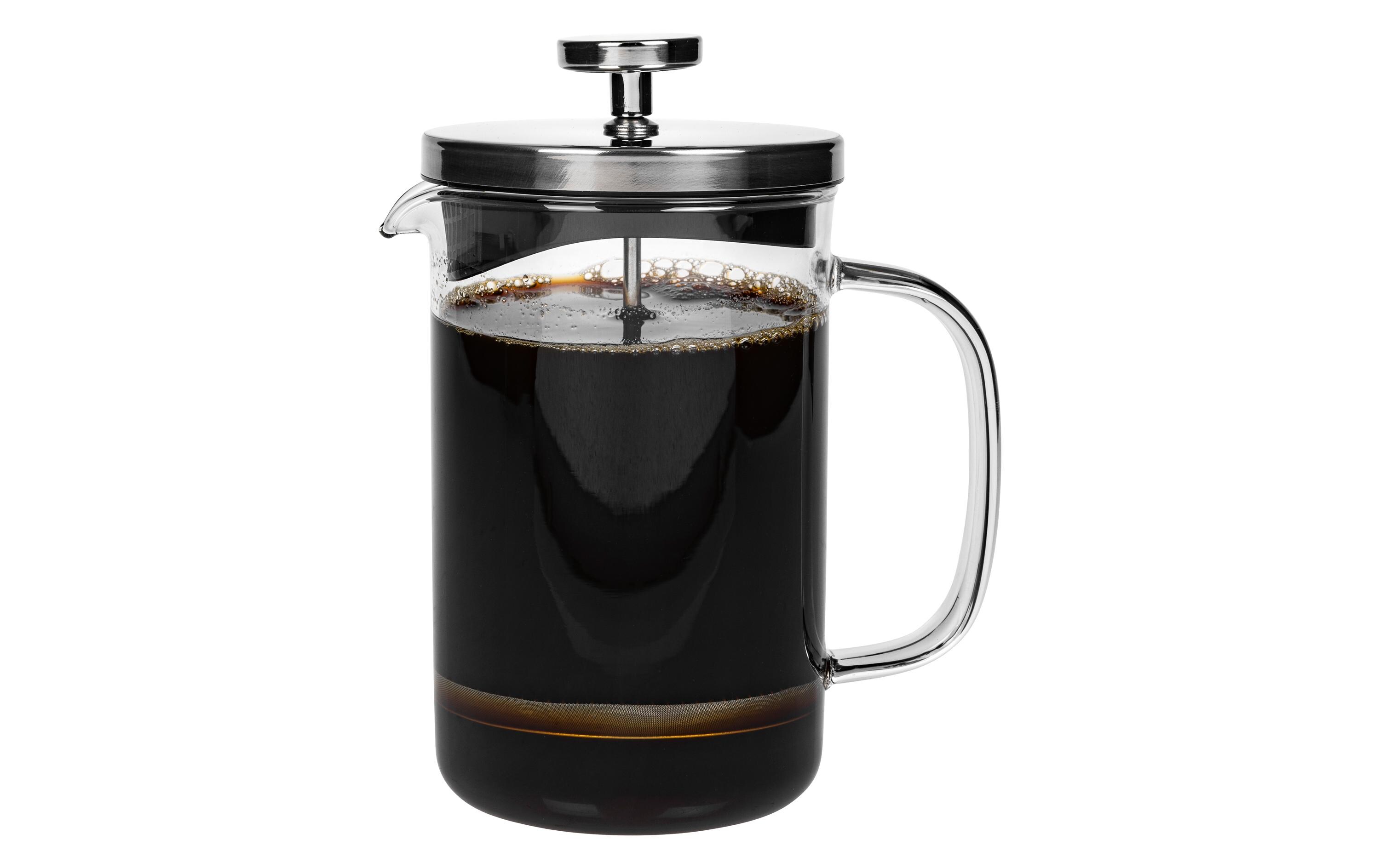Der Kaffeebereiter benötigt keinerlei Filter oder Kapseln und ist daher besonders umweltfreundlich. Einfach grob gemahlenes Kaffeepulver und heisses Wasser einfüllen, 4 Minuten warten und anschliessend den Kolben langsam herunterdrücken - fertig. Pro Aufguss können Sie mit dem Haushaltsgerät drei Tassen Kaffee zubereiten. Durch den Plastikgriff können Sie den Bereiter, auch wenn er mit kochendem Wasser gefüllt ist, gefahrlos anheben. Die Beine des Rahmens schützen die Oberfläche vor Beschädigungen durch Wärme und der Rahmen bietet der Glaskanne zusätzlichen Schutz.