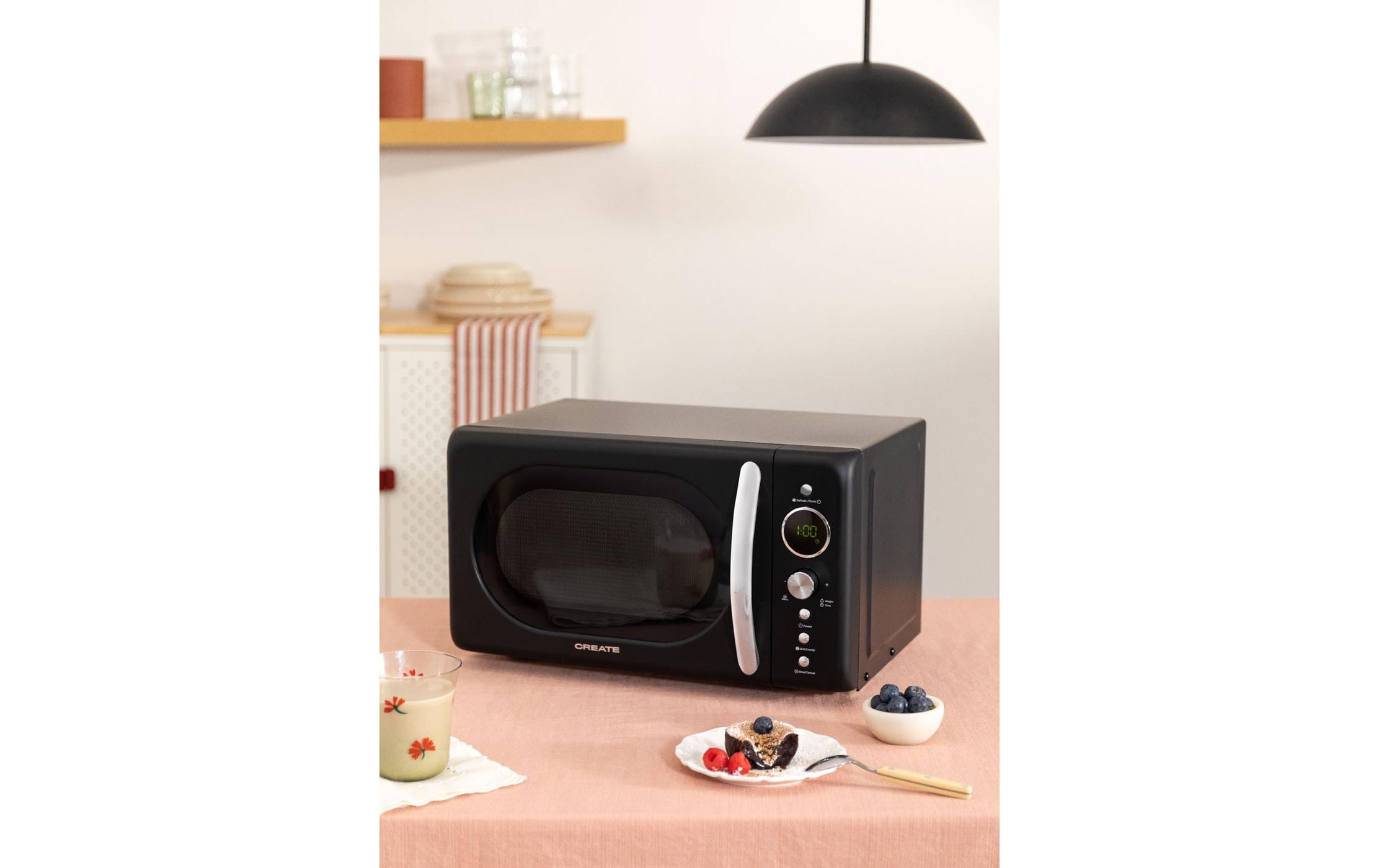 Retro-Stil Mikrowelle mit Grill und 20 L Fassungsvermögen. Sie bietet Funktionen wie Defrost, Quick Start und Autocook, sowie 9 vorinstallierte Menüs. Mit einer Mikrowellenleistung von 700 W und Grillleistung von 900 W ist sie vielseitig und leicht zu bedienen. Das LCD-Display zeigt Programme, Garzeiten und Uhrzeit an.