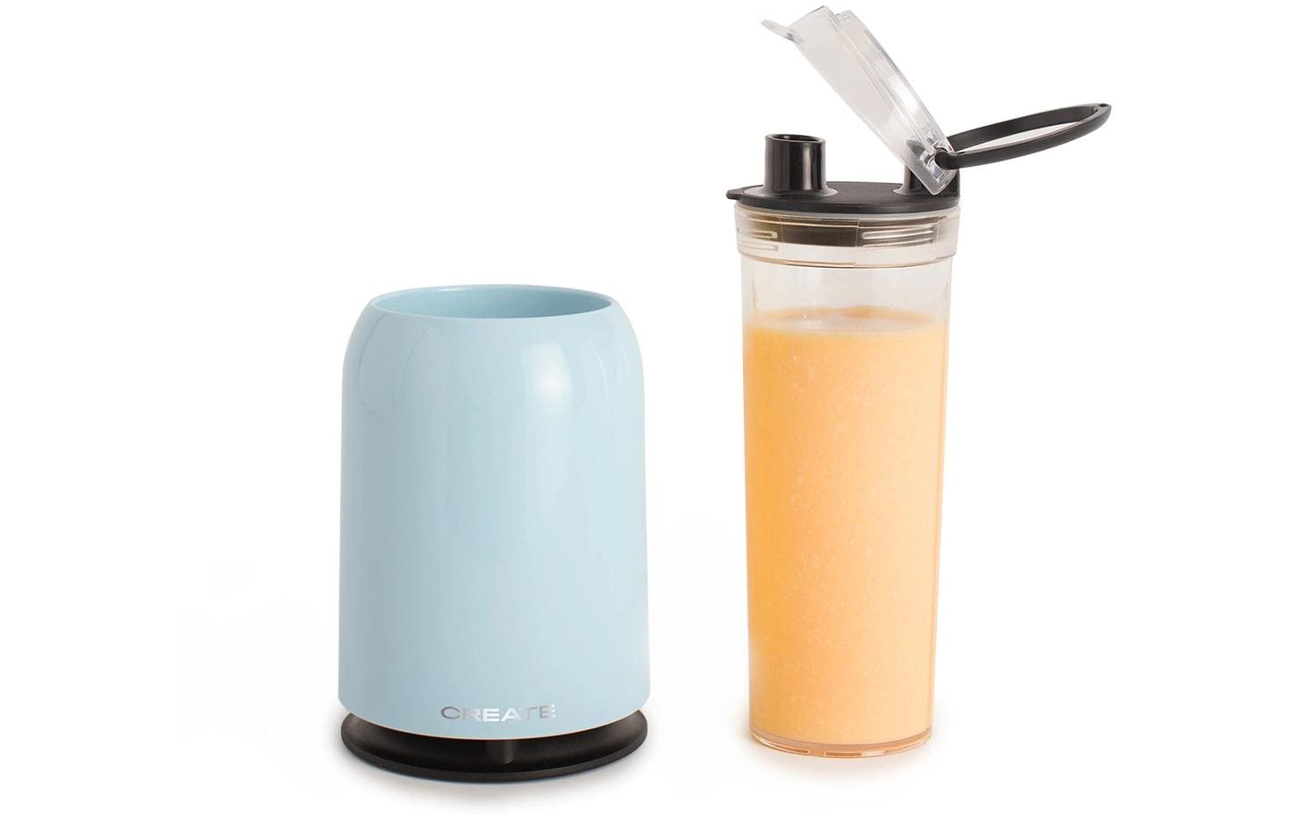Tragbarer Standmixer mit 230 W Leistung, ideal für die Zubereitung von Säften, Shakes und Smoothies. Der mitgelieferte 400-ml-Becher mit Deckel und faltbarem Griff ermöglicht es, Getränke unterwegs zu geniessen.