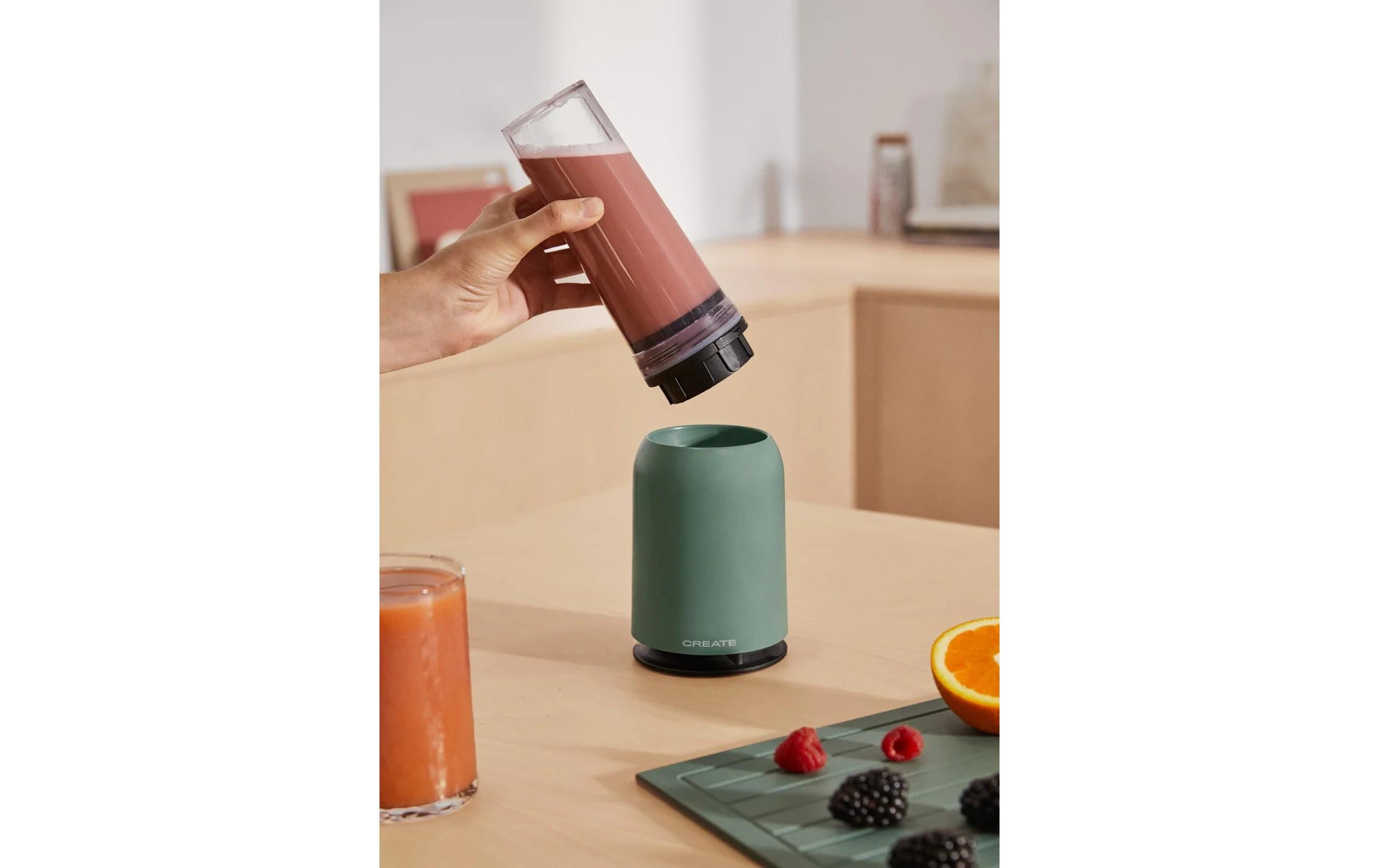 Tragbarer Standmixer mit 230 W Leistung, ideal für die Zubereitung von Säften, Shakes und Smoothies. Der mitgelieferte 400-ml-Becher mit Deckel und faltbarem Griff ermöglicht es, Getränke unterwegs zu geniessen.