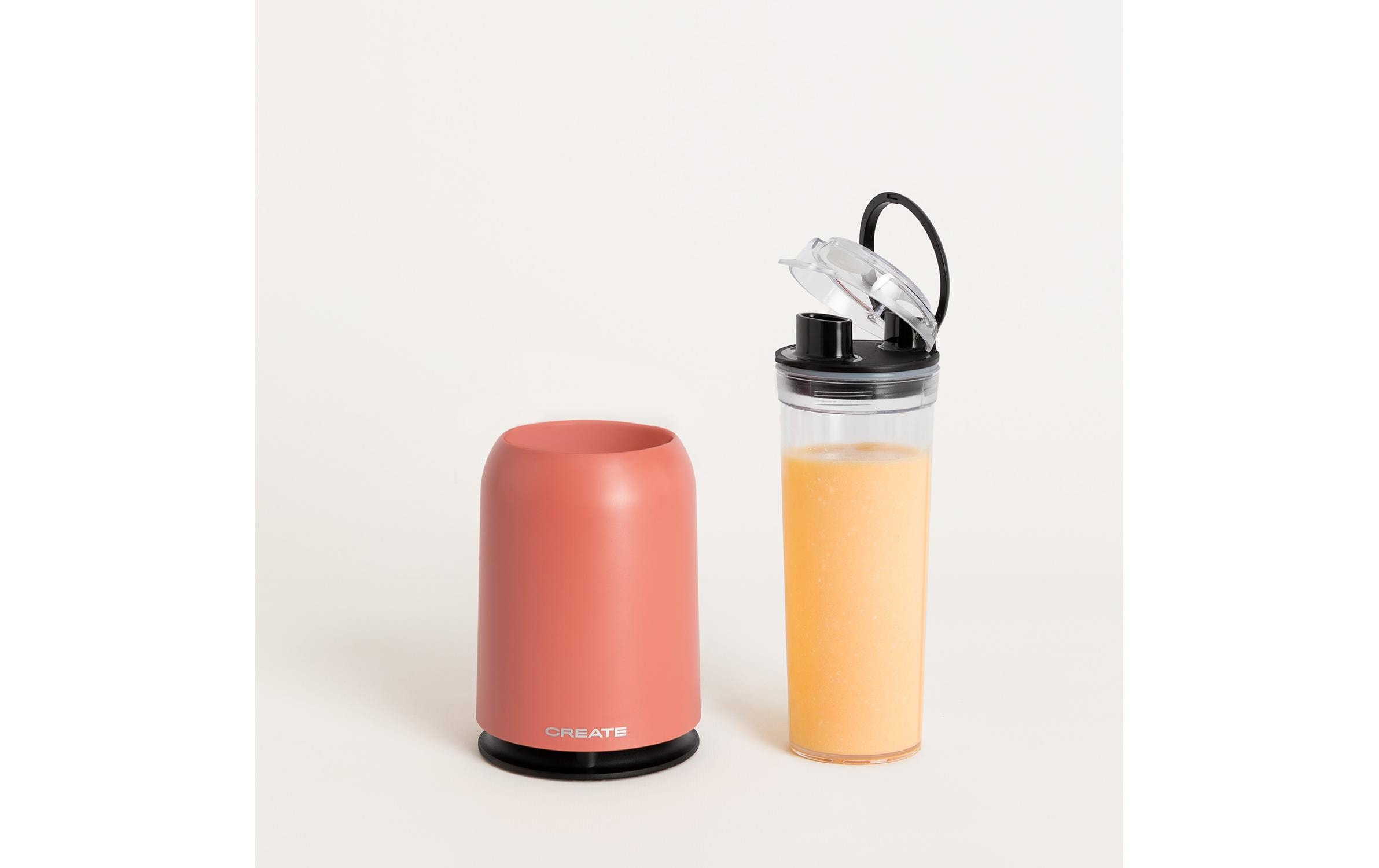 Tragbarer Standmixer mit 230 W Leistung, ideal für die Zubereitung von Säften, Shakes und Smoothies. Der mitgelieferte 400-ml-Becher mit Deckel und faltbarem Griff ermöglicht es, Getränke unterwegs zu geniessen.