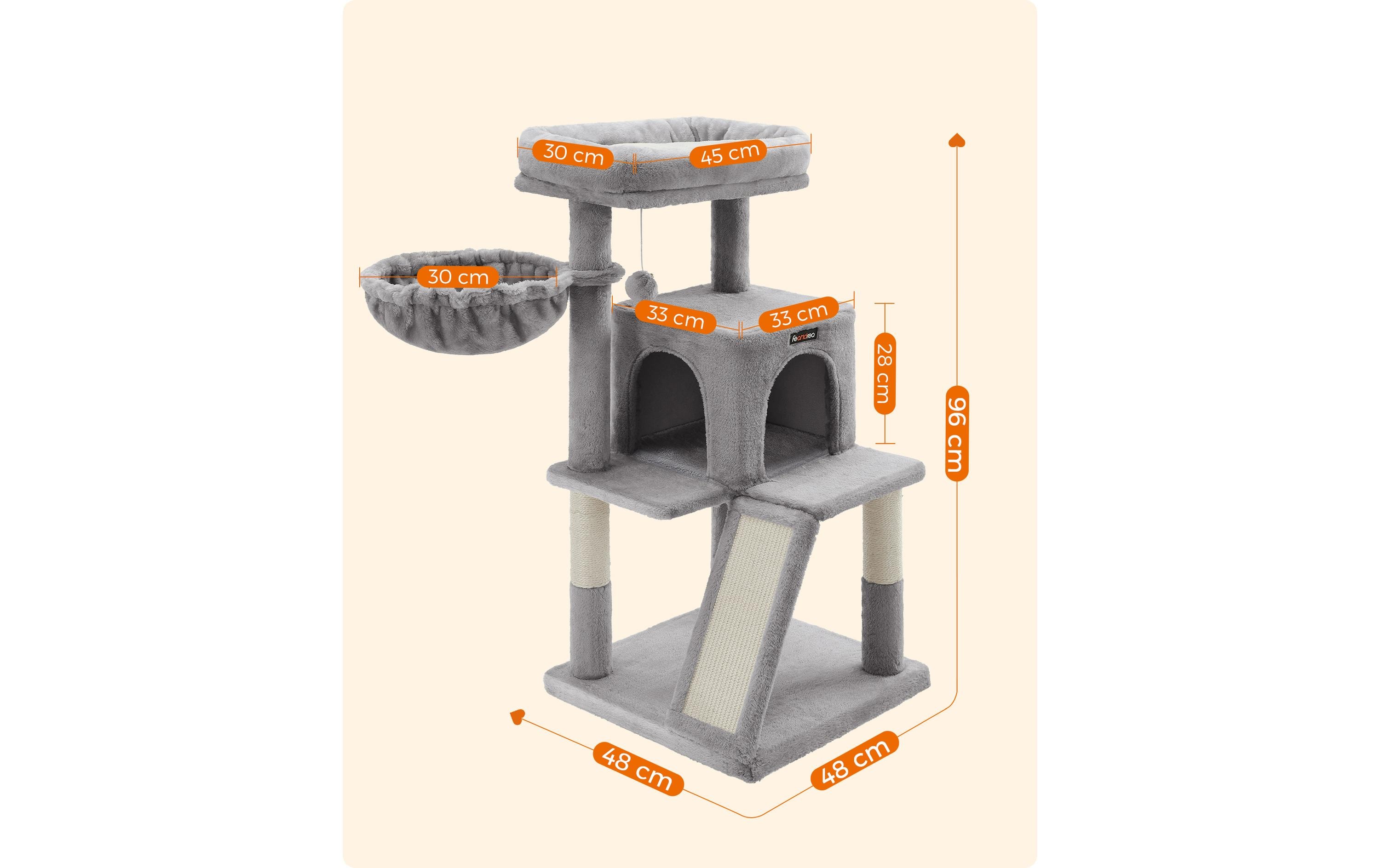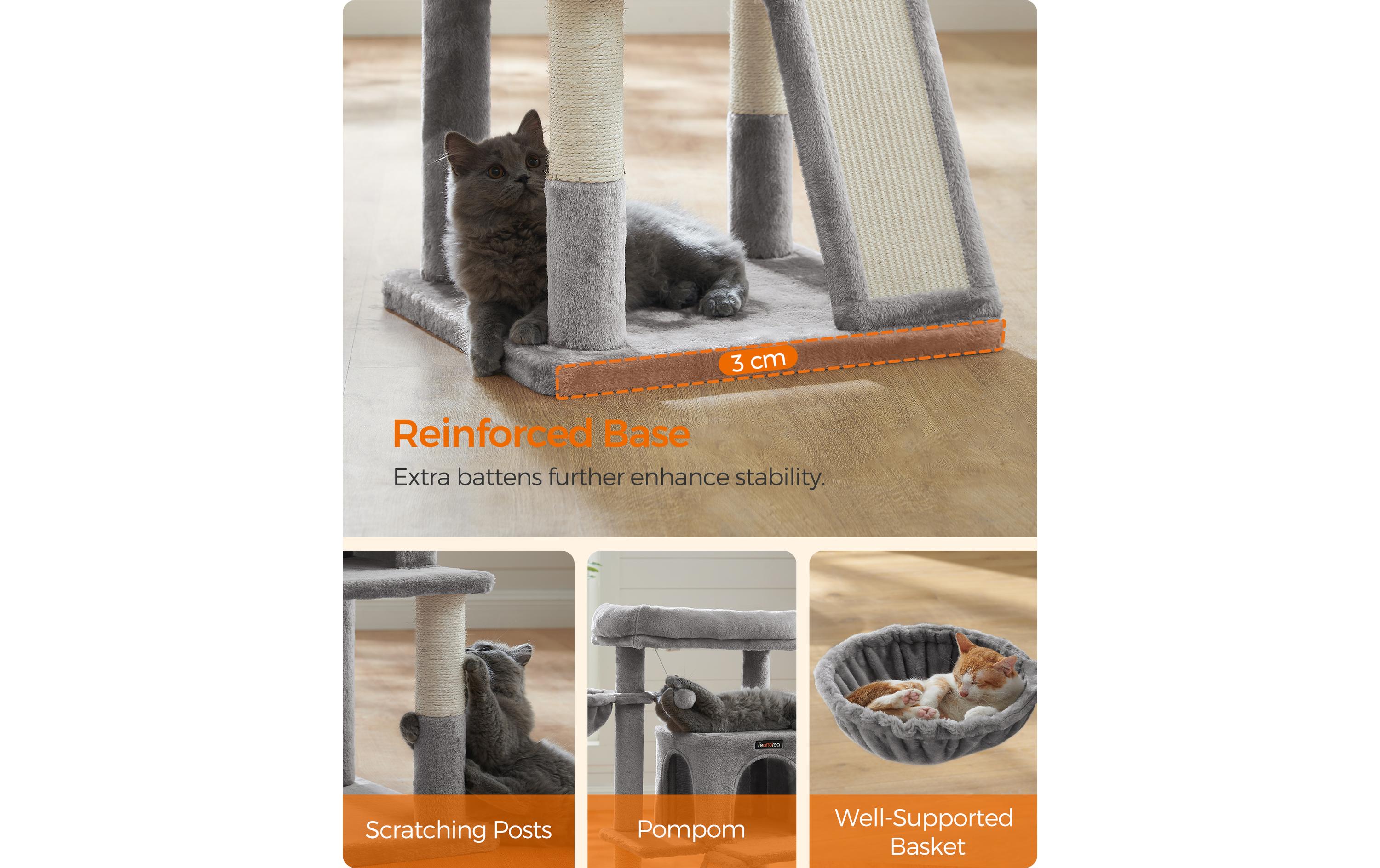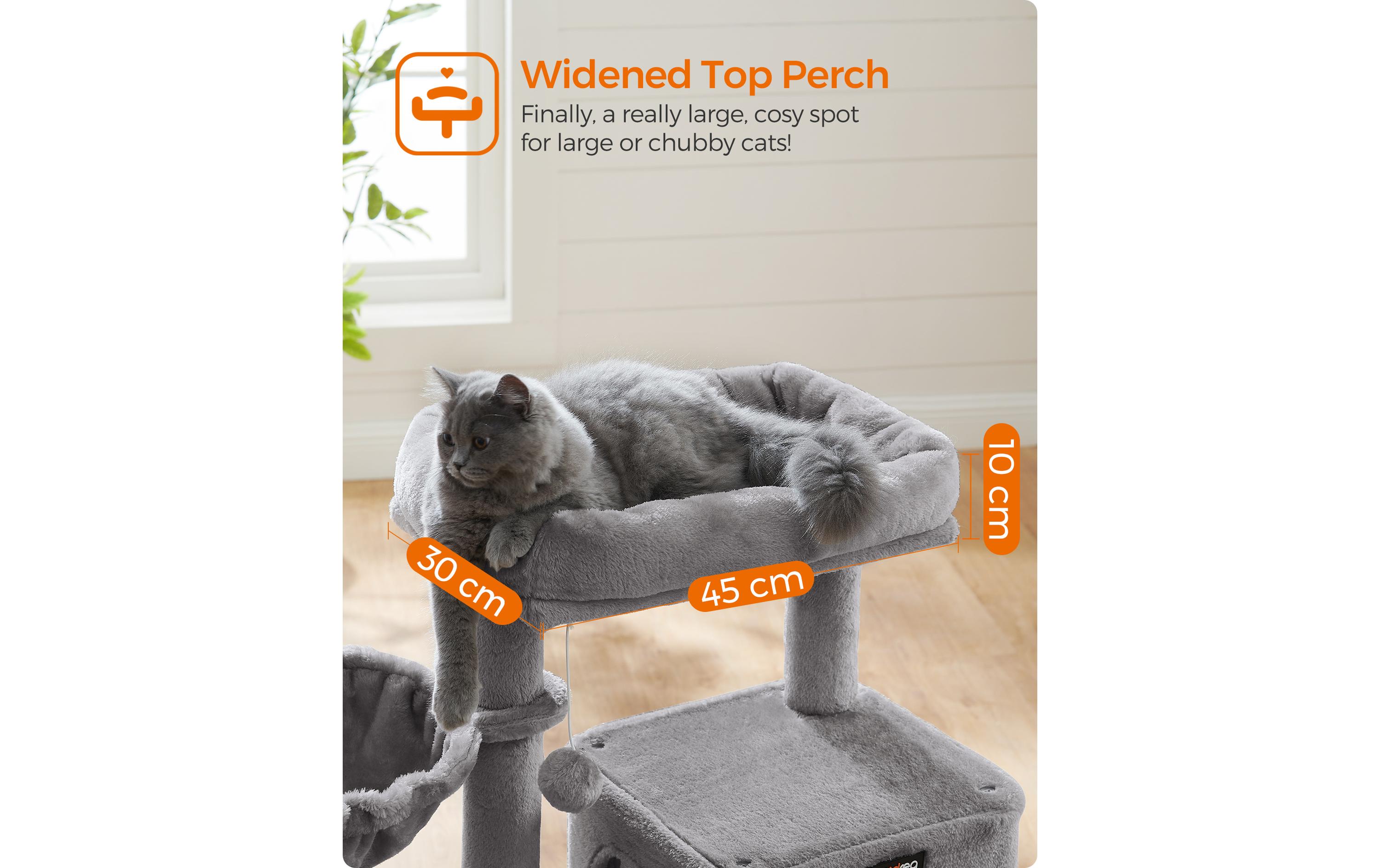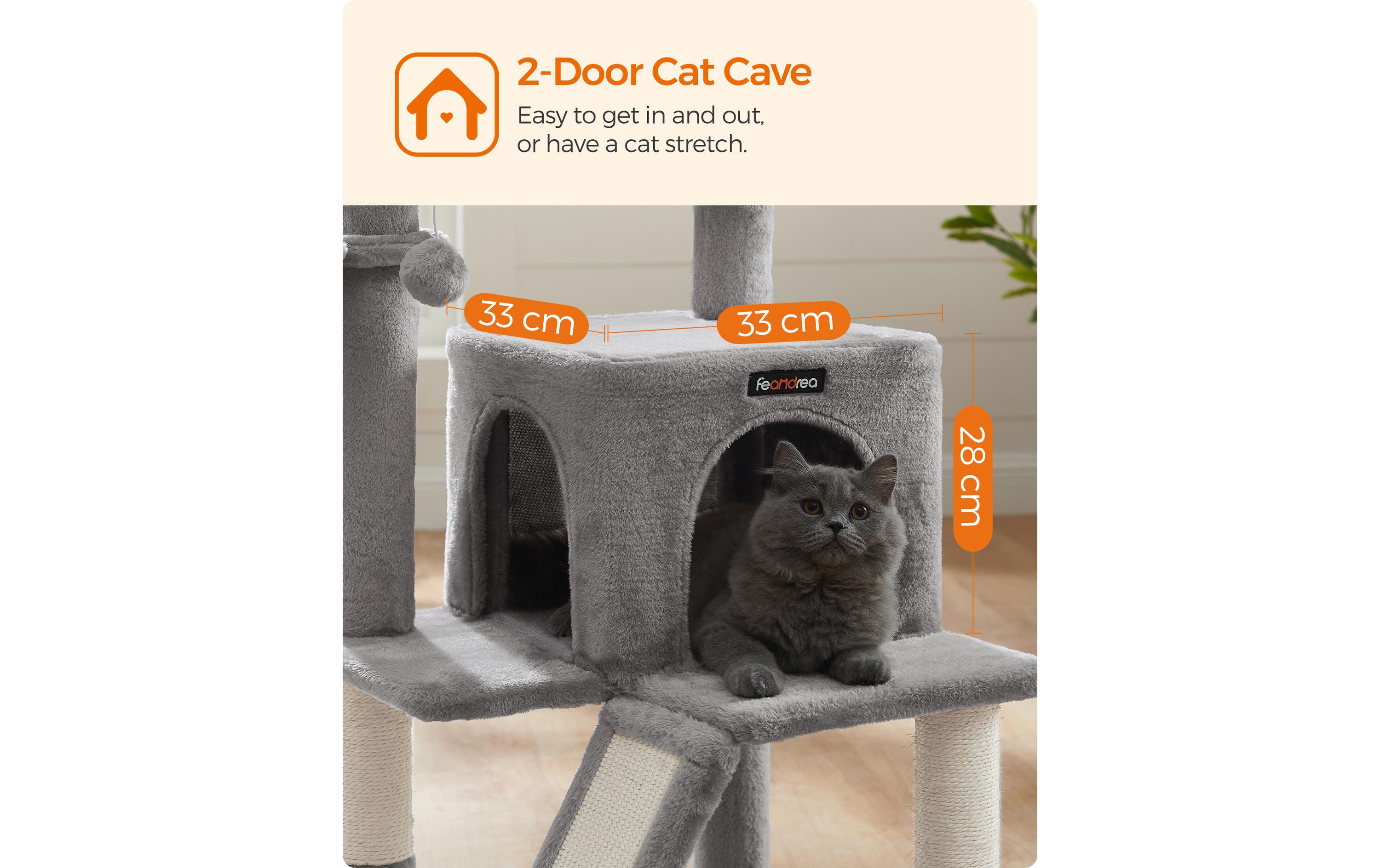 In den Kreativwerkstätten von FEANDREA springen zwei süsse Kätzchen herum, die alle Kratzbäume persönlich unter die Lupe nehmen und ihr tierisches Feedback hierzu abgeben. So erfahren die Designer von FEANDREA aus erster Hand bzw. aus erster Pfote, ob die Produkte den Ansprüchen von verwöhnten Schnurrhaarträgern genügen. Ein Kratzbaum mit zahlreichen Vorteilen Der oben gezeigte Katzenturm hat den Miezentest bestanden. Vor allem gefielen die gemütliche und hübsche Kuschelhöhle sowie die Rampe inklusive Kratzbrett. Aber auch die mit Sisal und Plüsch umwickelten Stämme, die stufenförmig angeordneten, gemütlichen Plattformen sowie die Liegemulde waren heiss begehrt. Egal ob Sie ein junges Kätzchen oder einen Katzensenior besitzen, dieser 48 x 48 x 96 cm (L x B x H) grosse Katzenturm bietet ein Zuhause für jeden Stubentiger. Welchen Teil unseres Kratzbaums wird Ihre Katze wohl am liebsten haben? Denken Sie, dass sie nicht aufhören können wird, ihre Krallen am Kratzbrett zu wetzen?