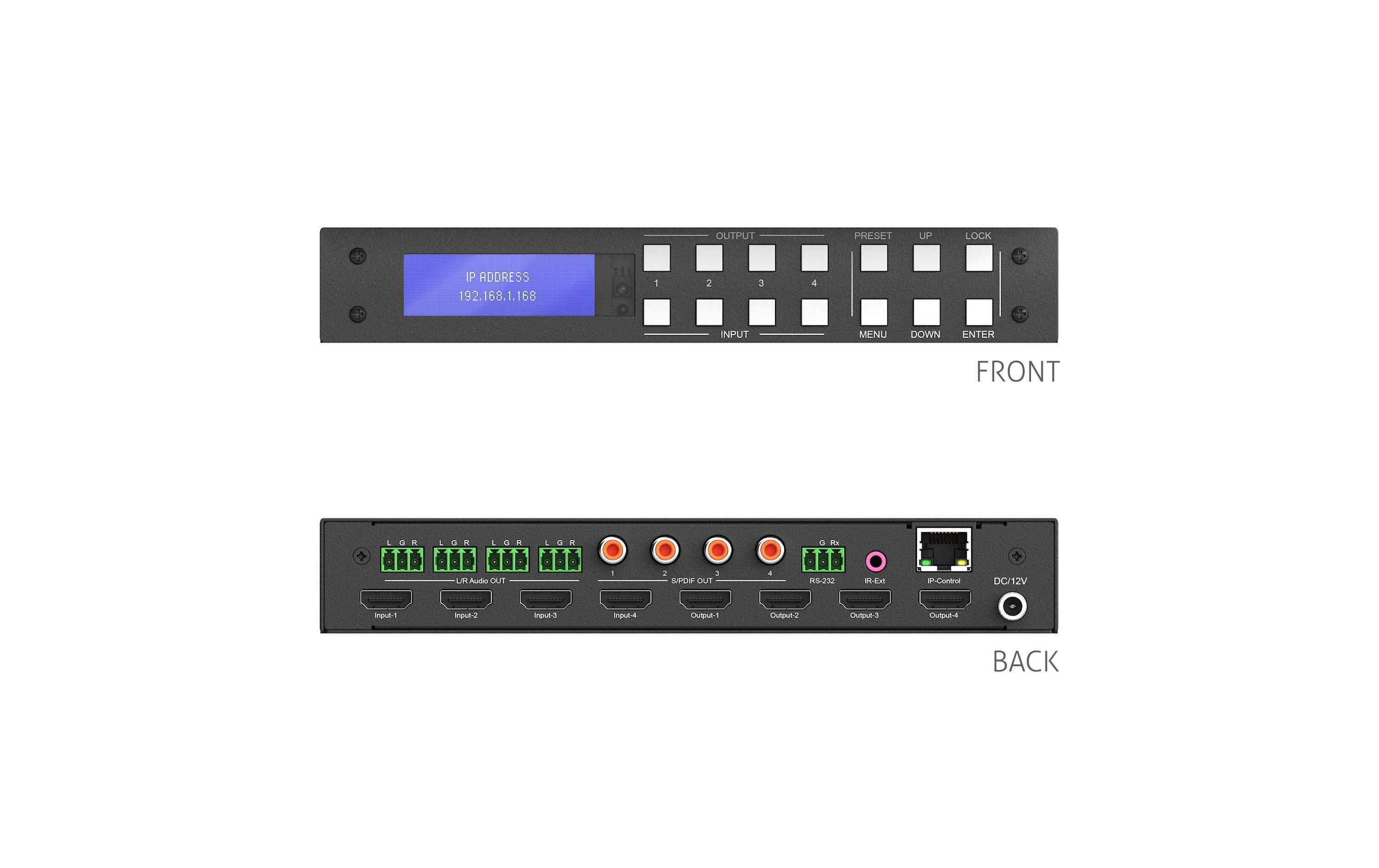 Ein grosszügiges LCD Display an der Gerätevorderseite zeigt alle relevanten Einstellungen und Konfigurationen auf einen Blick. Die umfangreichen Menüeinstellungen können per Fernbedienung oder Frontpanel-Tasten vorgenommen werden. Hier können u. a. die Audio- und Videoeinstellungen für jeden einzelnen Kanal inkl. EDID-Konfiguration, Audiomodus und Audioauskopplung festgelegt werden. Bis zu acht Eingangs- / Ausgangs-Voreinstellungen (Presets) können in diesem Menü ebenfalls gespeichert und wieder aufgerufen werden. Auch sind alle Systemeinstellungen, von RS232 Baud-Rate über DHCP Netzwerkkonfiguration bis hin zu Neustart und Reset in diesem Menü verfügbar.