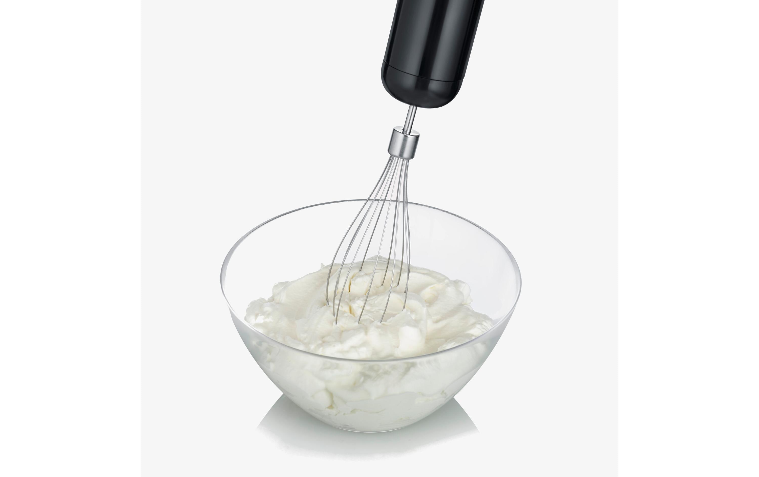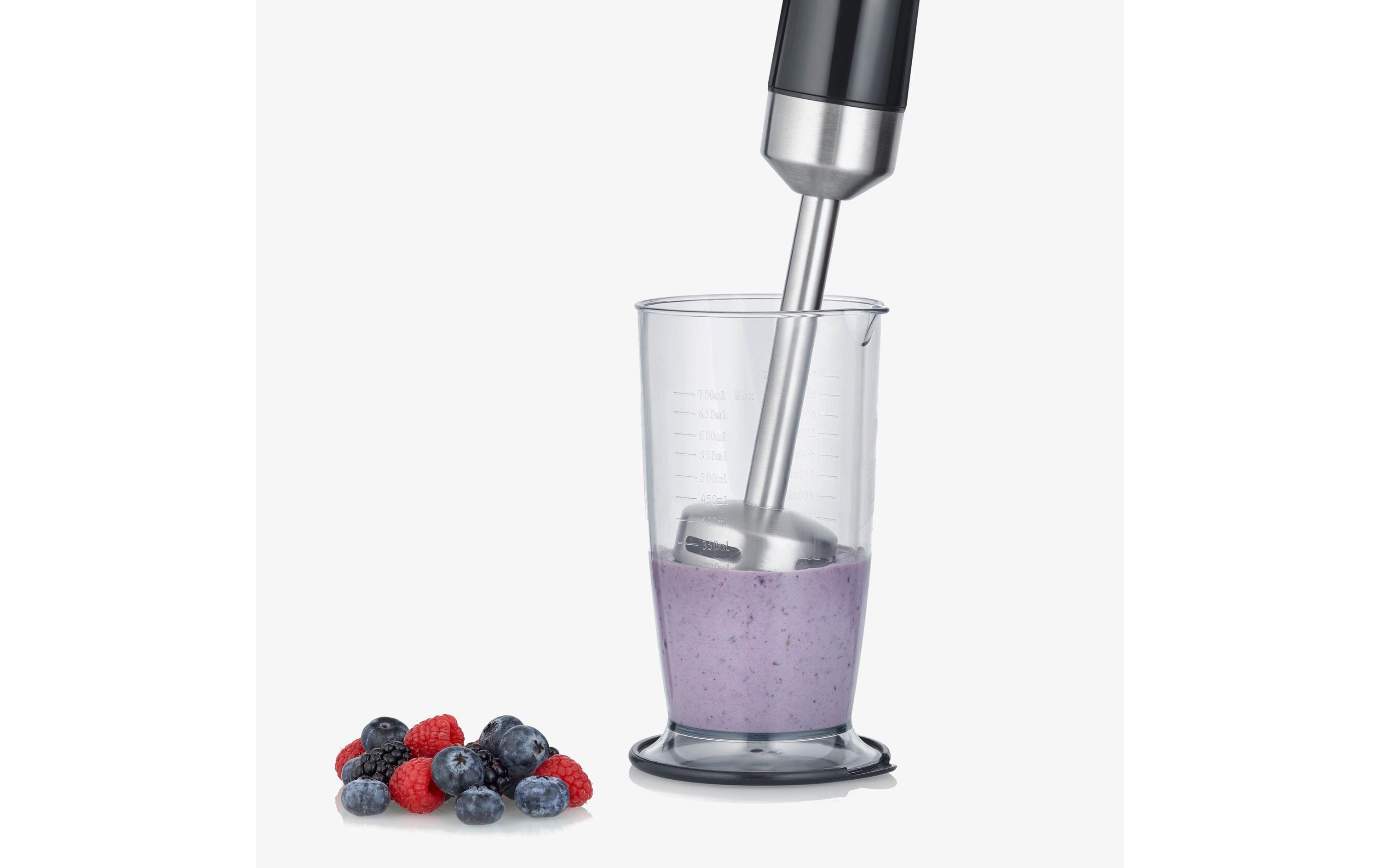 Inklusive Multizerkleinerer (0.5 Liter), Mixbehälter mit Deckel (0,7 Liter), Schneebesen und Edelstahl-Rührstab