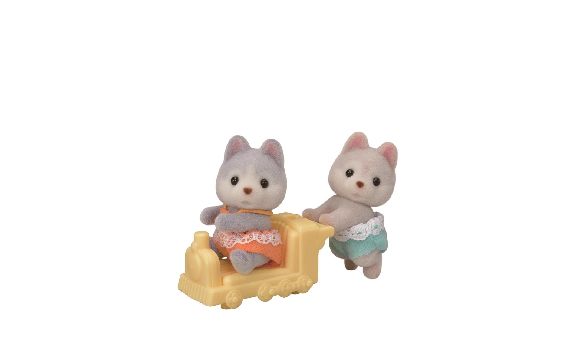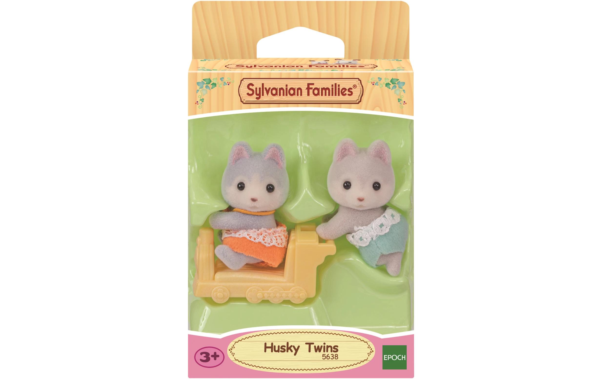 Die Sylvanian Families Husky Zwillinge Jeremy und Amber sind wirklich sehr verspielt und lustig. Jeremy liebt es mit seiner Schwester Amber draussen zu spielen. Er ist ein sehr guter grosser Bruder der sich viel um die kleinen Drillinge kümmert. Er spielt oft mit ihnen Guck-Guck und schiebt sie in seiner kleinen Lokomotive durch das ganze Haus. Er möchte wie seine grossen Geschwister einmal einen Schlitten ziehen. Wie ihr Bruder spielt Amber gerne mit ihrem kleinen Bruder und ihren Schwestern. Sie ist grossartig darin lustige Grimassen zu ziehen wenn sie Guck-Guck spielen und Starwettbewerbe veranstalten. Da haben die Drillingsbabys immer viel zu lachen. Im Sylvanian Families Husky Zwillinge Set sind zwei bewegliche Husky Figuren und eine kleine Lokomotive enthalten. Die beiden Zwillinge sind ca. 4 cm gross und für Kinder ab drei Jahren geeignet.
