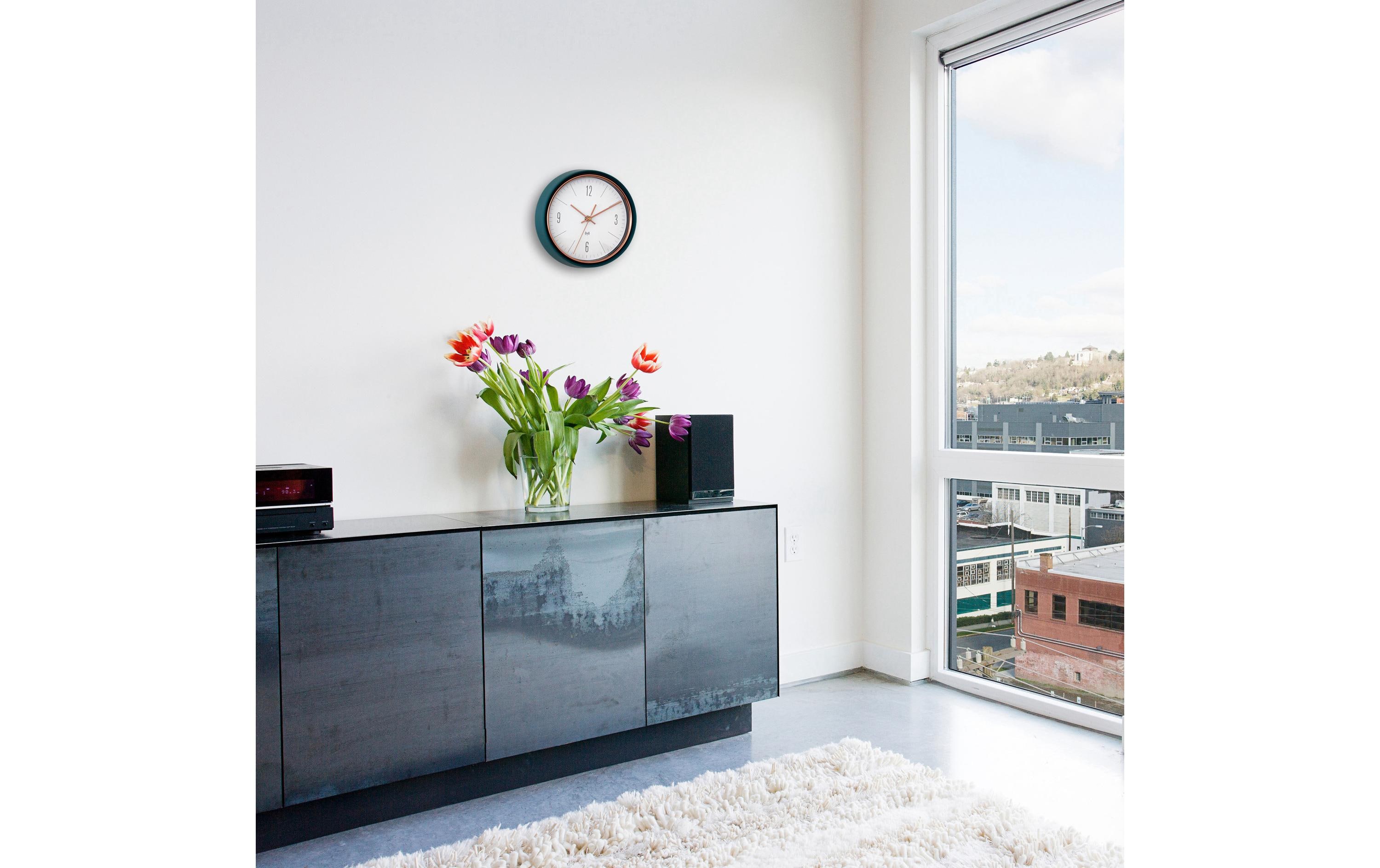 Kurz zurück zum stilvollen Auftritt: Die Kupferdetails geben der Wanduhr ihren hochwertigen Look und der matte Metallrahmen mit Glasfront unterstreicht das elegante Design.