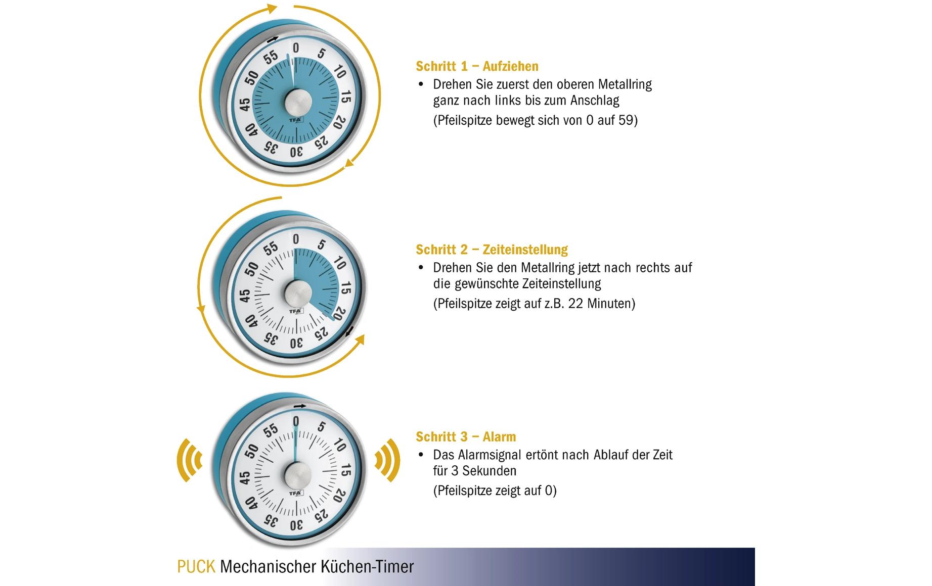Die patentierte farbige Restzeit-Anzeige zeigt anschaulich, wie viel Zeit noch bleibt. Per Signalton werden Sie zuverlässig zum richtigen Zeitpunkt erinnert. Bitte beachten Sie, dass der mechanische Timer erst ganz aufgezogen werden muss, bevor er funktionstüchtig ist.