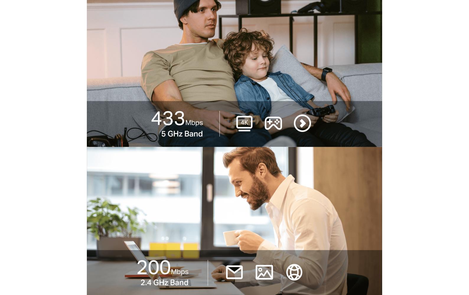 Der Archer T2UB Nano empfängt Wi-Fi-Signale auf zwei separaten Bändern. Durch die Unterstützung der 256QAM-Technologie wird die Datenrate auf 2.4 GHz von 150 Mbps auf 200 Mbps erhöht, was eine 33% schnellere Leistung bedeutet. 433Mbps auf 5GHz ist ideal für HD-Videostreaming und verzögerungsfreies Online-Gaming, während 200Mbps auf 2.4GHz perfekt für den normalen Gebrauch wie z.B. Websurfen mit älteren Geräten ist.