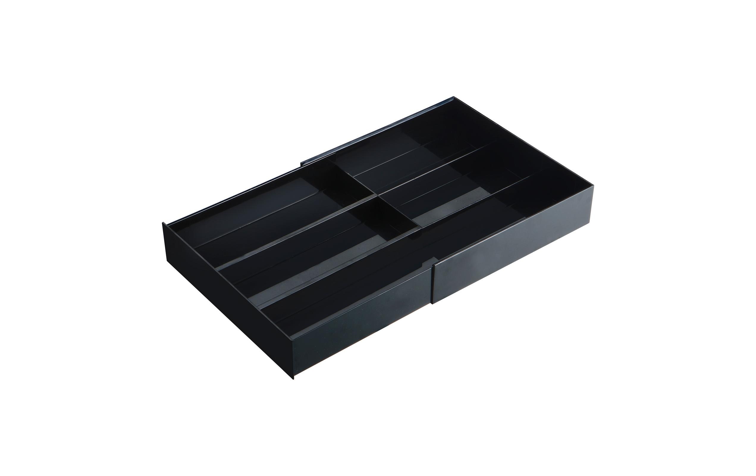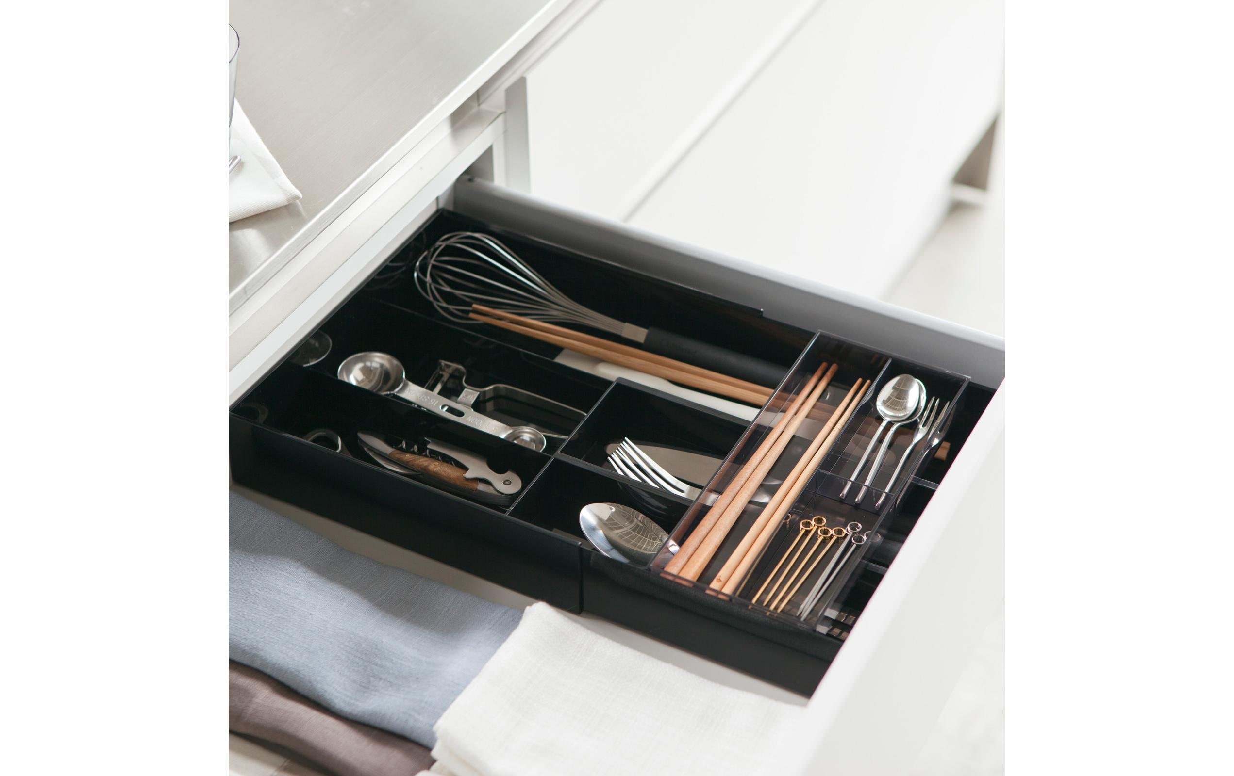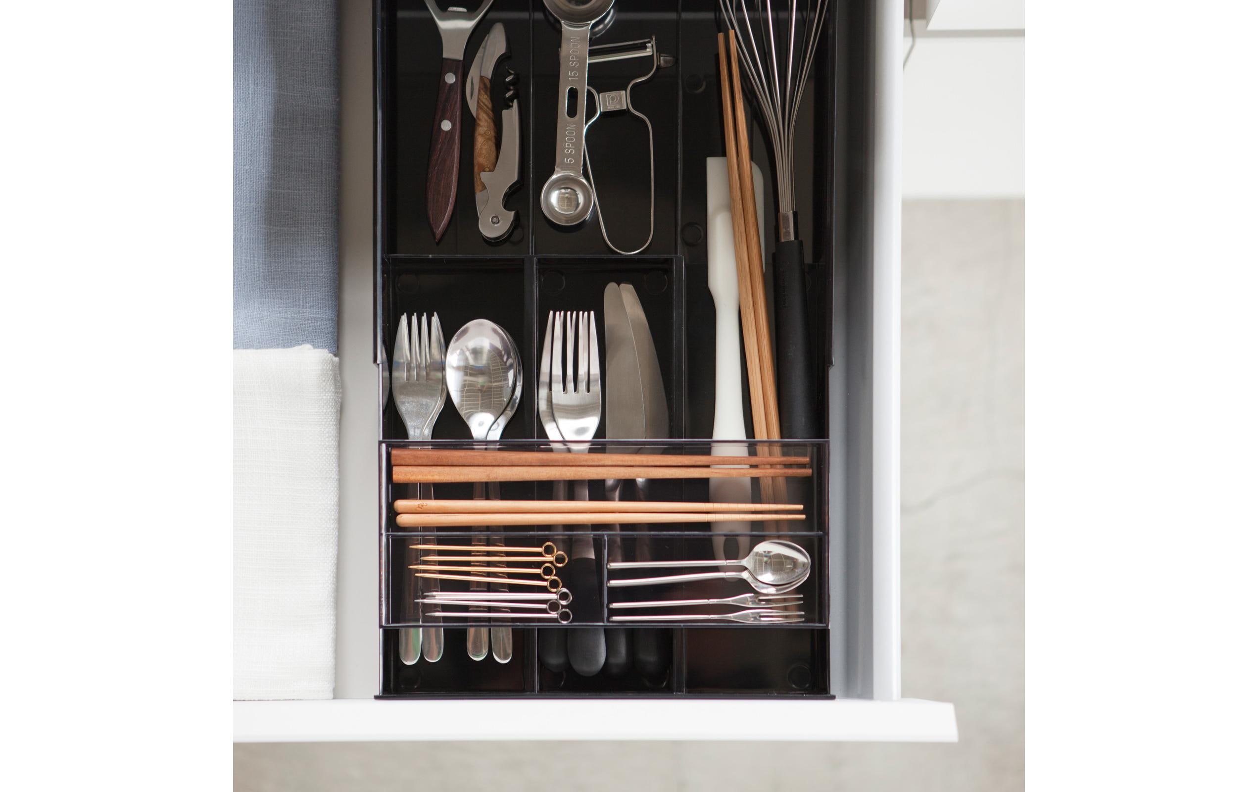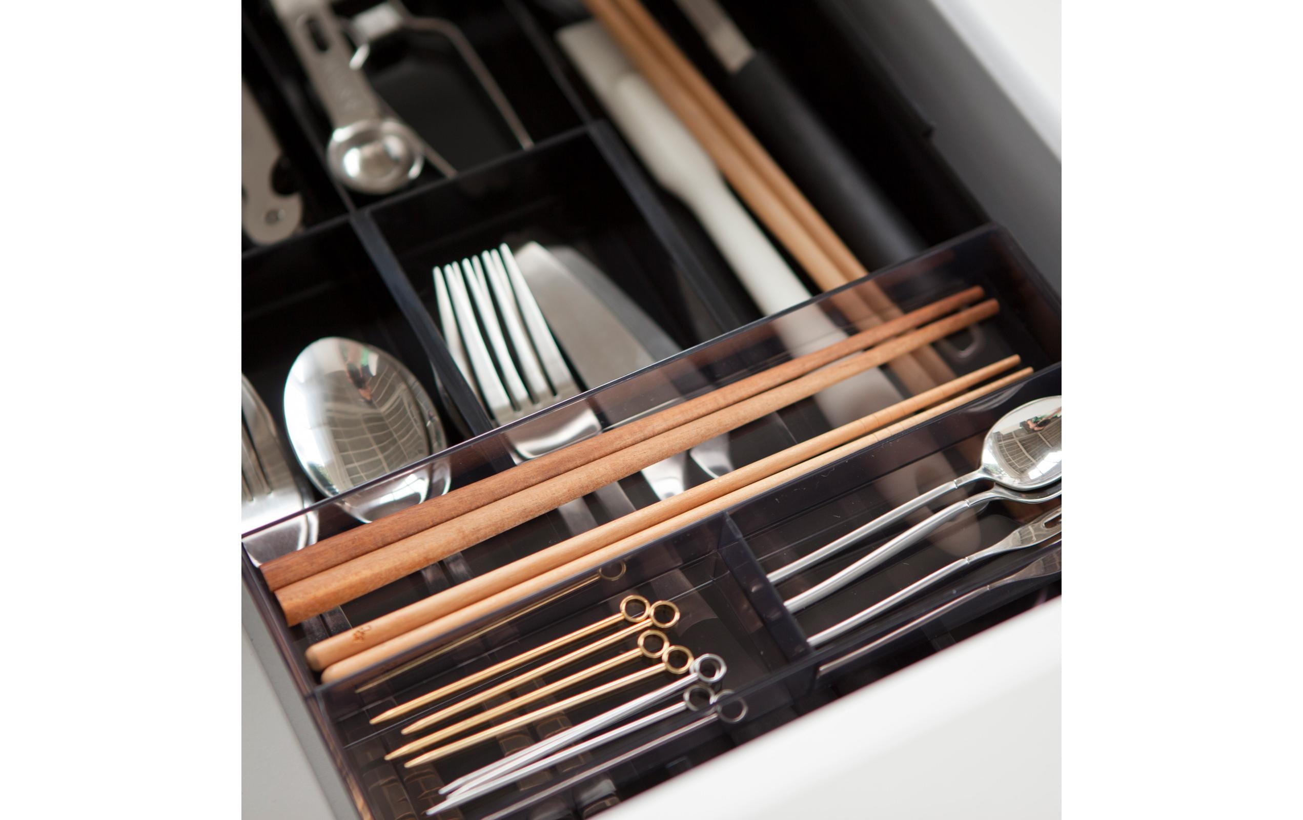 Dieser einfach gestaltete Besteckkasten von Yamazaki ist ausziehbar. Sie können seine Länge perfekt an die Länge der Regalschublade anpassen. In der oberen Schublade können Sie kleine Gegenstände wie Teelöffel aufbewahren, in der unteren ausziehbaren Schublade längere Werkzeuge.